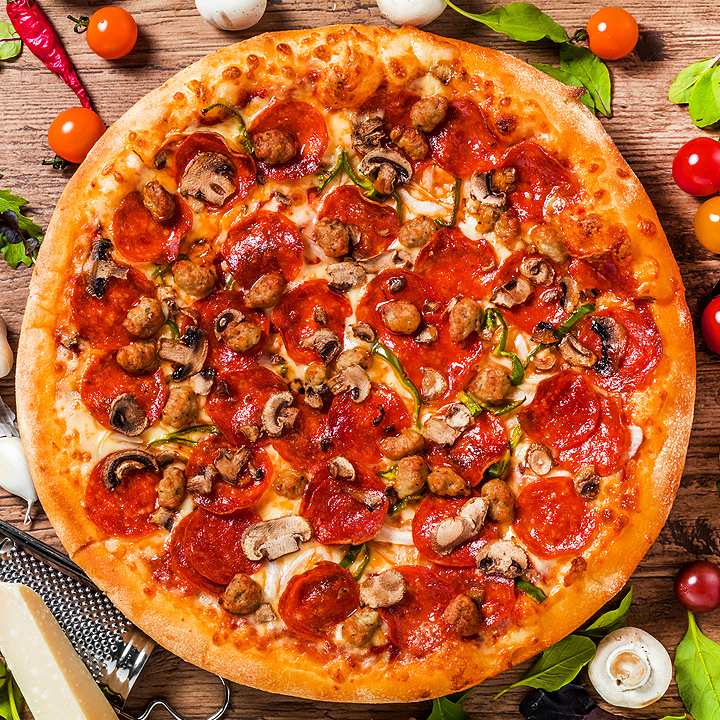 томатный соус, ветчина, томаты, шампиньоны, сыр Моцарелла, сыр Пармезан